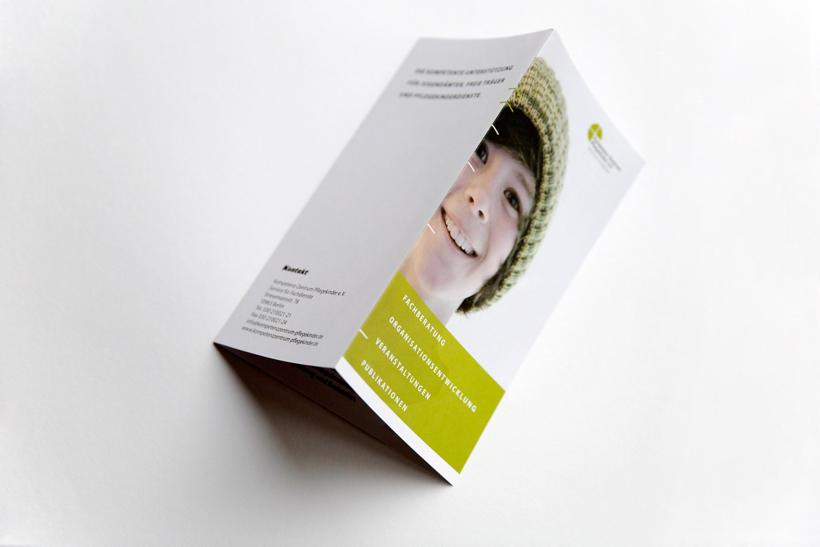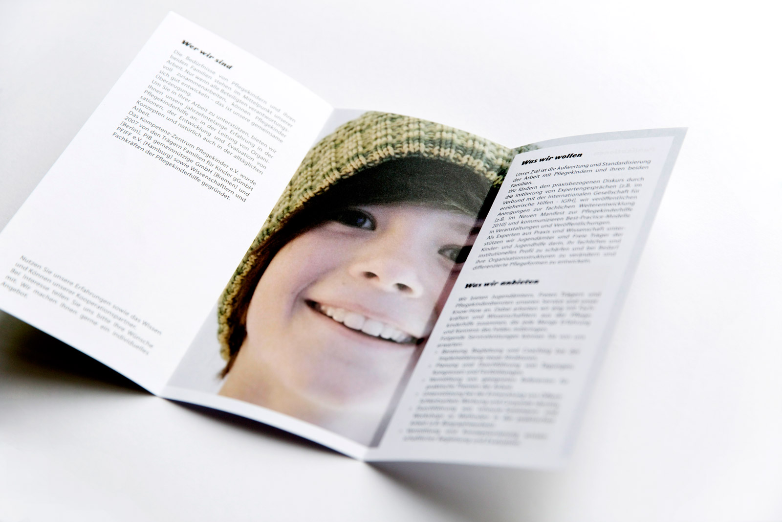 Das Kompetenz-Zentrum für Pflegekinder stellt sich vor: „Wer wir sind, was wir wollen, was wir anbieten, was wir publizieren“. Alles auf einen Blick, alles in einem Flyer, alles in einer klaren Gestaltung, alles mit einem liebenswerten Lächeln.